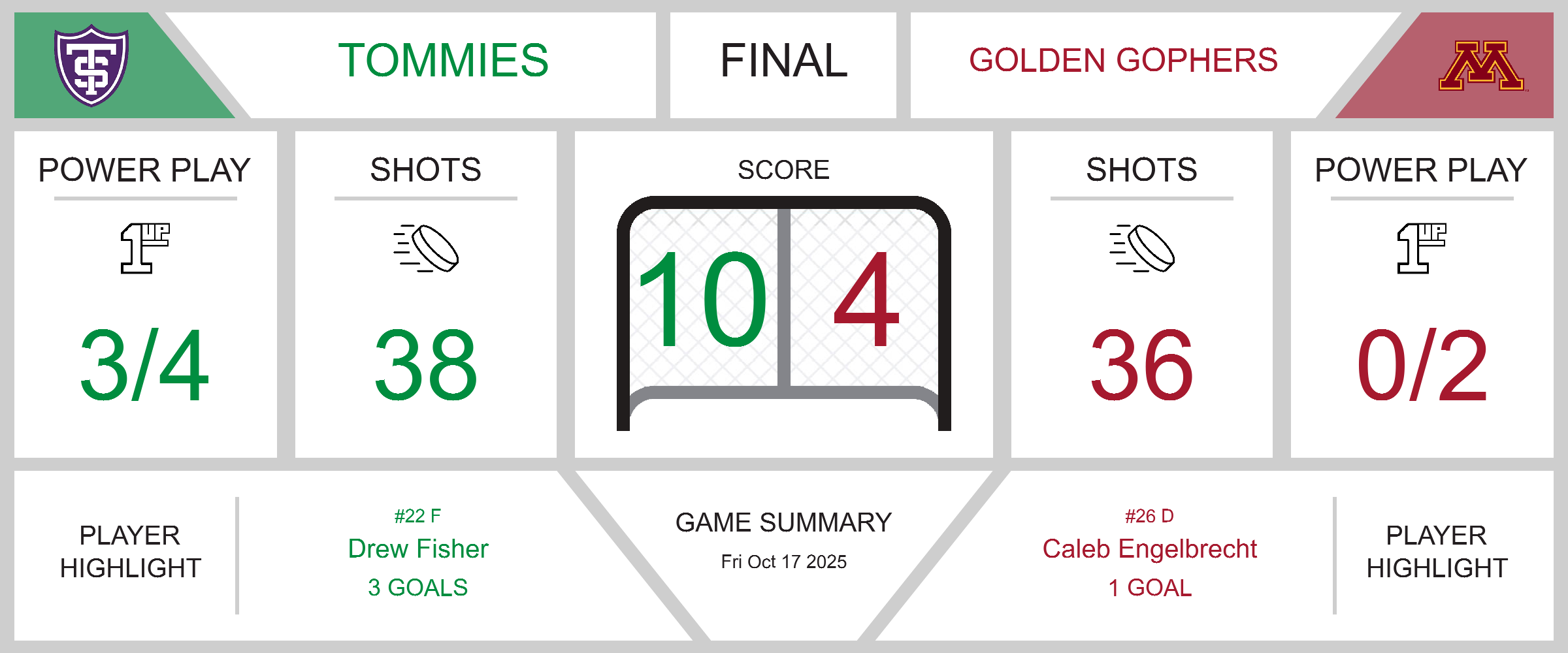 The Golden Gophers put up a good fight, with 36 shots compared to the Tommies’ 38. However, the Tommies’ powerplay proved to be more effective, scoring on 3 out of 4 attempts, while the Gophers were unable to capitalize on their 2 powerplay opportunities.