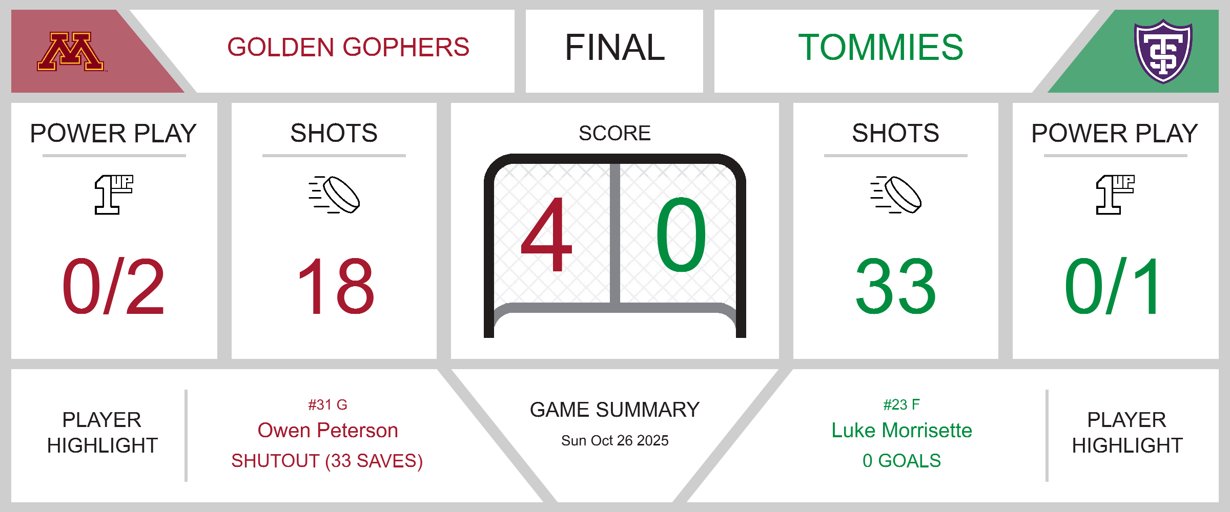 Neither team was successful in their powerplay attempts, with the Tommies going 0/1 and the Golden Gophers 0/2.