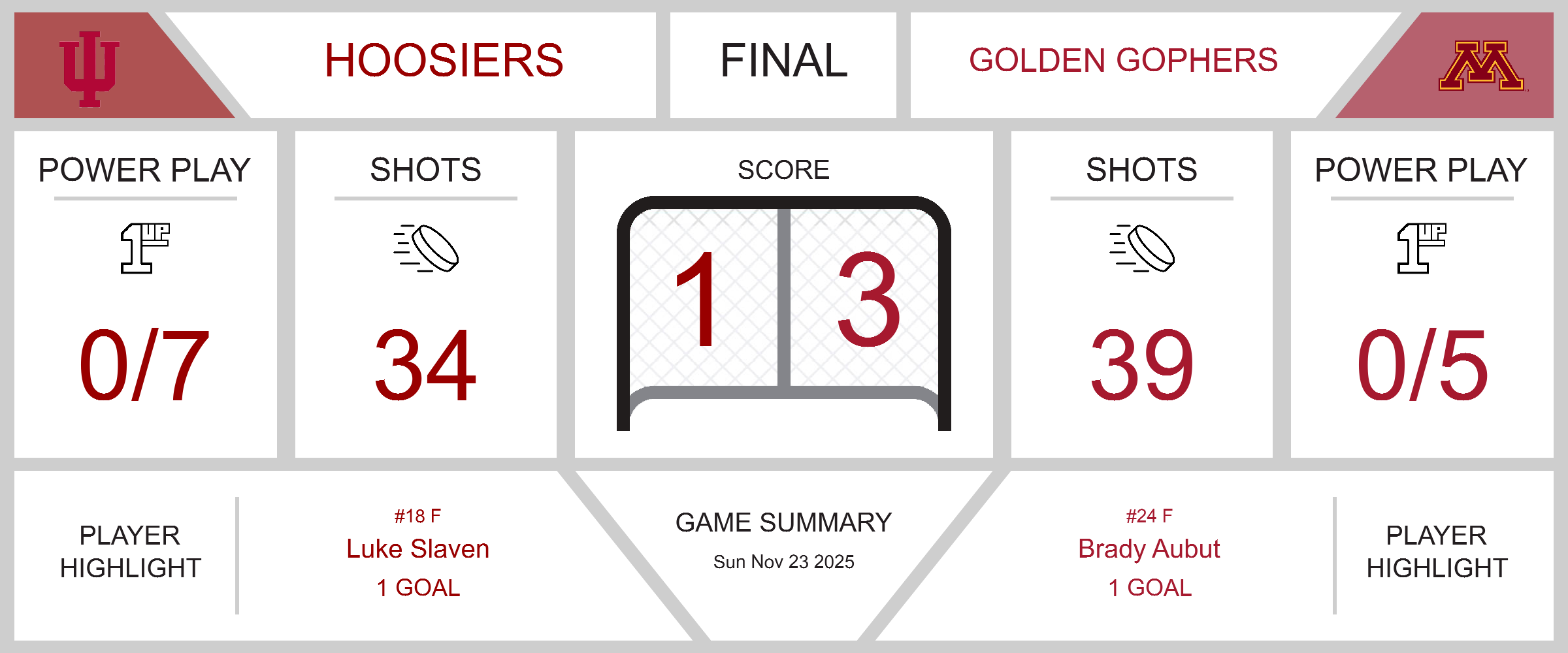 The Gophers outshot the Hoosiers with 39 shots compared to Indiana’s 34. Despite multiple powerplay opportunities for both teams, neither was able to capitalize. The Gophers went 0/5 on power plays, while the Hoosiers were 0/7.