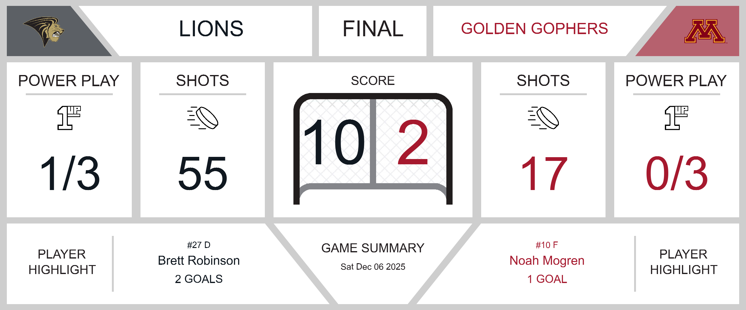 The Gophers will have to regroup quickly as they face the Lions again on Saturday, December 6th at 3:30 pm CST at the Centene Community Ice Center. They will be looking to bounce back from this heavy loss and put up a stronger performance in the second game of this back-to-back series.