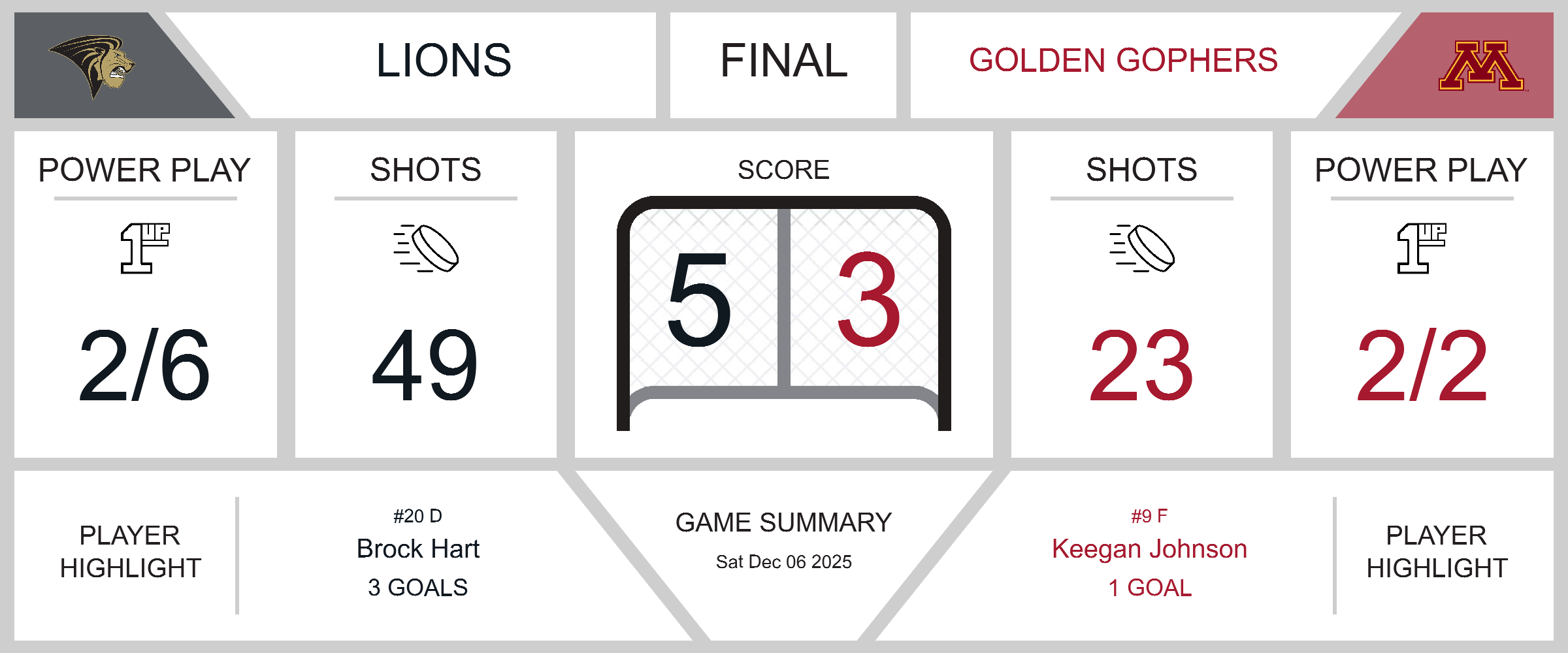 The Gophers came into the game with high energy, but the Lions’ aggressive offense proved to be too much. Despite having fewer shots on goal (23 to the Lions’ 49), the Gophers managed to score on 2 of their 2 powerplays. However, the Lions capitalized on their powerplay opportunities as well, scoring on 2 of their 6 chances.