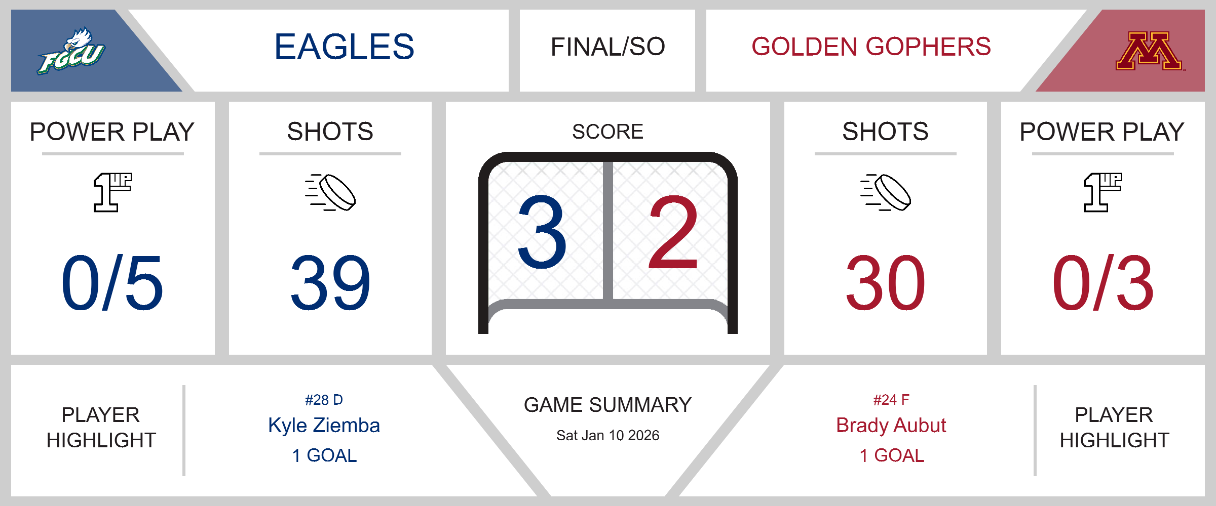 In a closely contested game at Hertz Arena, the University of Minnesota Golden Gophers fell to the Florida Gulf Coast University Eagles in a shootout, with a final score of 3-2. The game, which took place on January 9, 2026, saw both teams battling fiercely, with the Eagles managing to squeeze past the Gophers in the end.